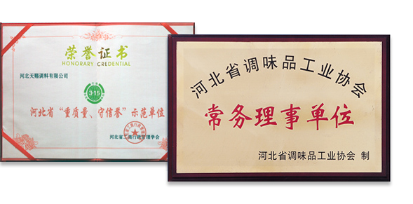 我公司先后榮獲 "河北省第五、六、七屆消費者信得過單位"、省級"食品安全先進企業"、省農行"AA級信用客戶";我公司是河北省調味品行業擁有五個"河北名牌"和二件"河北省著名商標"的企業標"的企業